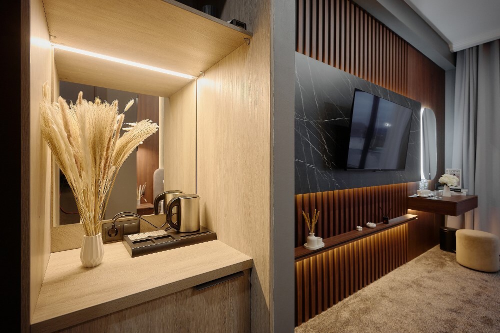 В номере: Стол, Сейф, Прикроватная тумбочка, Посуда, Набор одноразовой косметики, Кондиционер/Сплит-система, Зеркало, Ванная комната, Бесплатный Wi-Fi, Стул/Стулья, Телевизор, Телефон, Туалетные принадлежности, Фен, Холодильник, Чайник, Шкаф, Балкон/терраса, Кровать двуспальная, Кресло-кровать, Тапочки, Халат